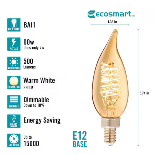 EcoSmart 1006 299 535 | (3-Pack) 60-Watt Equivalent BA11 Dimmable E12 Candelabra Fine Bendy Filament LED Vintage Edison Light Bulb Amber