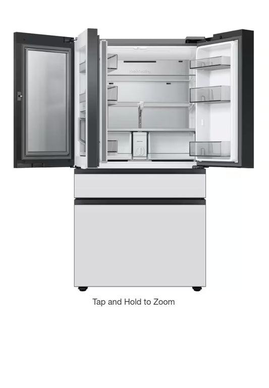 Samsung Bespoke 29 cu. ft. 4-Door French Door Smart Refrigerator with Beverage Center in White Glass, Standard Depth MODEL#RF23BB860012AA
