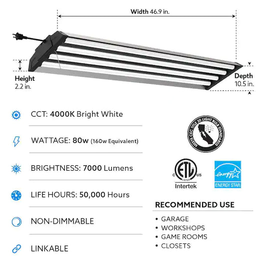 Commercial Electric 1003 622 076 | 4 ft. 80-Watt 4000K Bright White 4-Light 7000 Lumens Gray Integrated LED Linkable Hanging Shop Light with Pull Chain