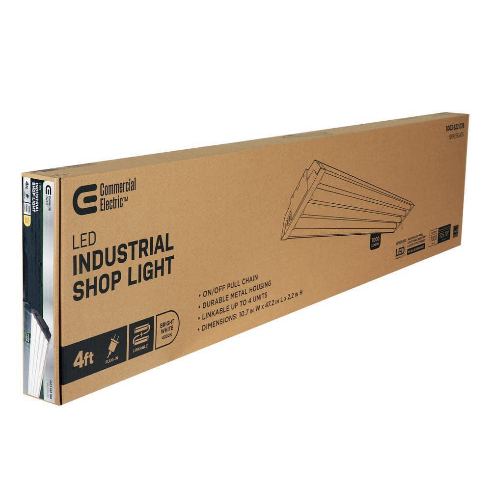 Commercial Electric 1003 622 076 | 4 ft. 80-Watt 4000K Bright White 4-Light 7000 Lumens Gray Integrated LED Linkable Hanging Shop Light with Pull Chain