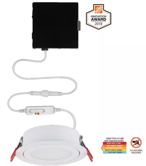 The Color Temperature Select Recessed Lighting Kits are the recessed lights of the future. Not only is each fixture is designed specifically for small spaces where height clearance is limited such as beams or ductwork, you can change the color temperature with a flick of a button. The integrated color changing switch is located on the cable so you can choose between a 2700, 3000, 3500, 4000 or 5000 Kelvin temperature to best suit your needs. 2700 or 3000 Kelvin is perfect for relaxing, 3500 or 4000 Kelvin is the ideal choice for everyday affairs and 5000 Kelvin is great for task lighting in a basement, hallway or work area. Energy Star certified, and Insulation Contact rated for direct contact with insulation, these lights won't overheat, do not require a bulky can and will last for years to come - 50 000 hours or approximately 34 years if used for 4 hours per day to be exact. Wet rated and certified airtight, this 4 in. kit is perfect for your bathroom, drop ceilings, outdoor soffits and all general lighting applications.