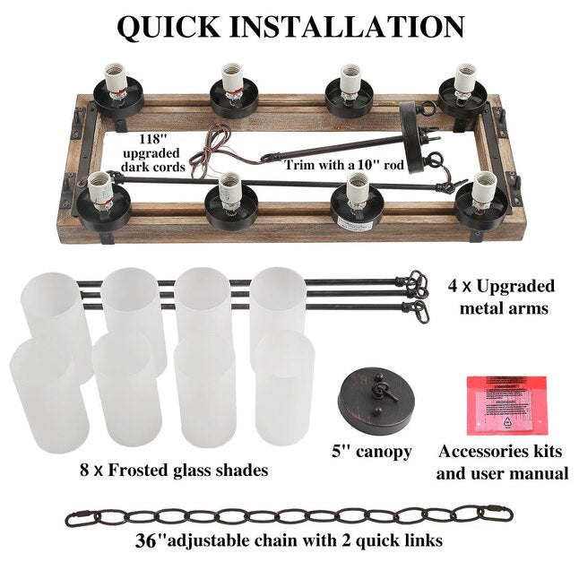 LNC A02988 | Laius 8 -Light Black and Distressed Wood Linear Farmhouse Frosted Glass Linear Large Hanging Kitchen Island Light