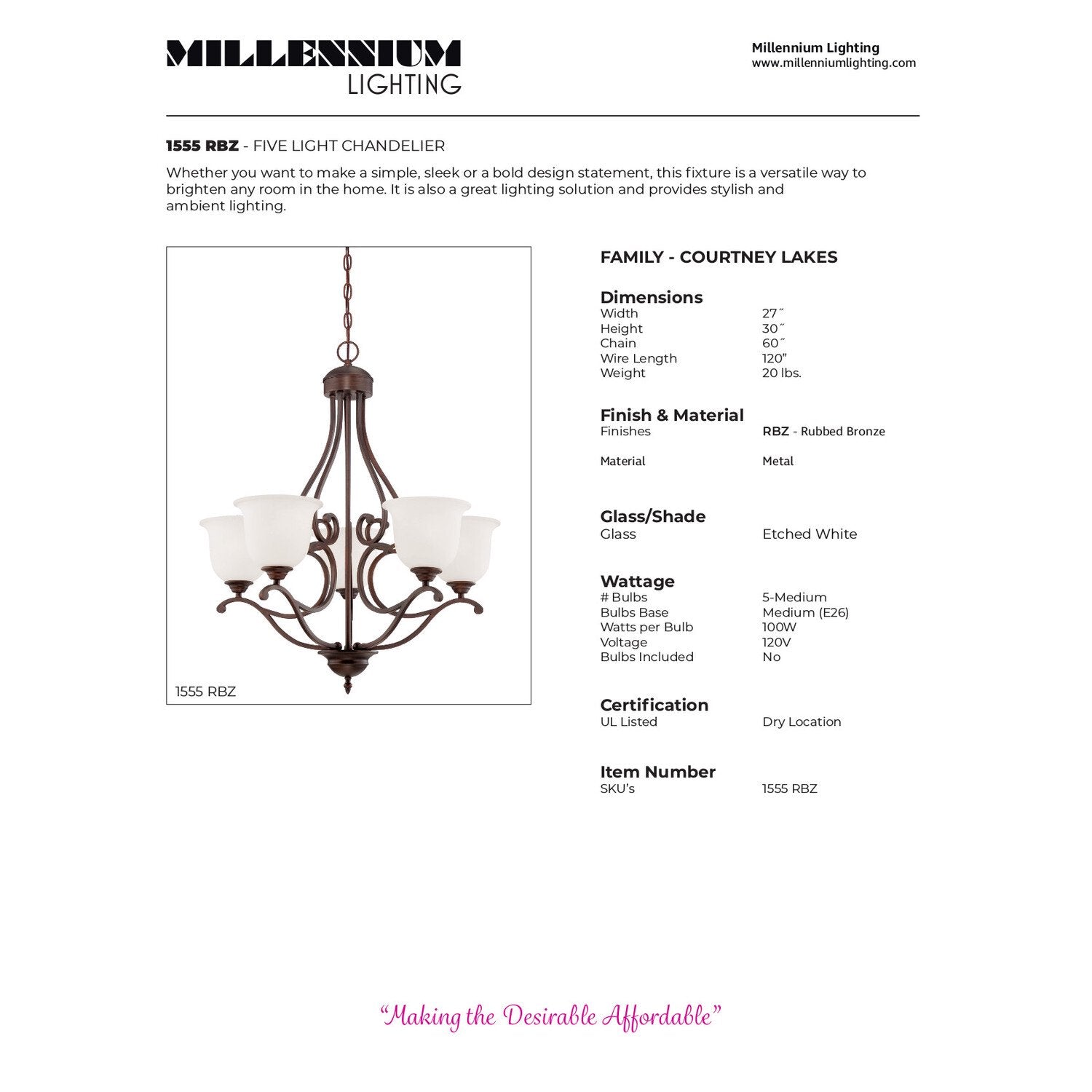 Millennium 1555-RBZ | Courtney Lakes 5 Light Chandelier Ceiling Fixture in Rubbed Bronze