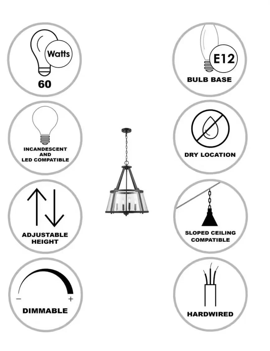 - Uses four 60-Watt candelabra E12 base bulbs, not included